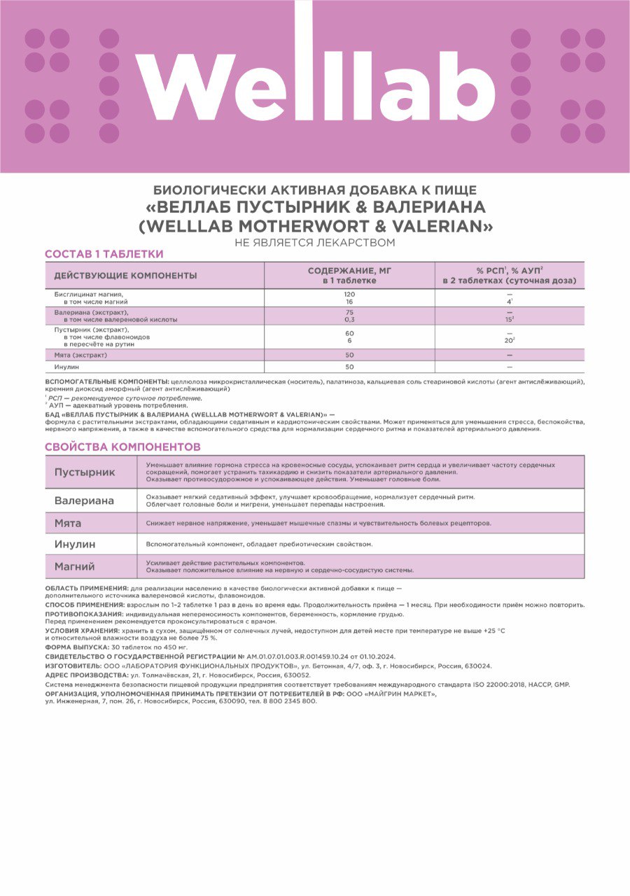 БАД с успокаивающим эффектом Welllab ПУСТЫРНИК & ВАЛЕРИАНА, 30 таблеток